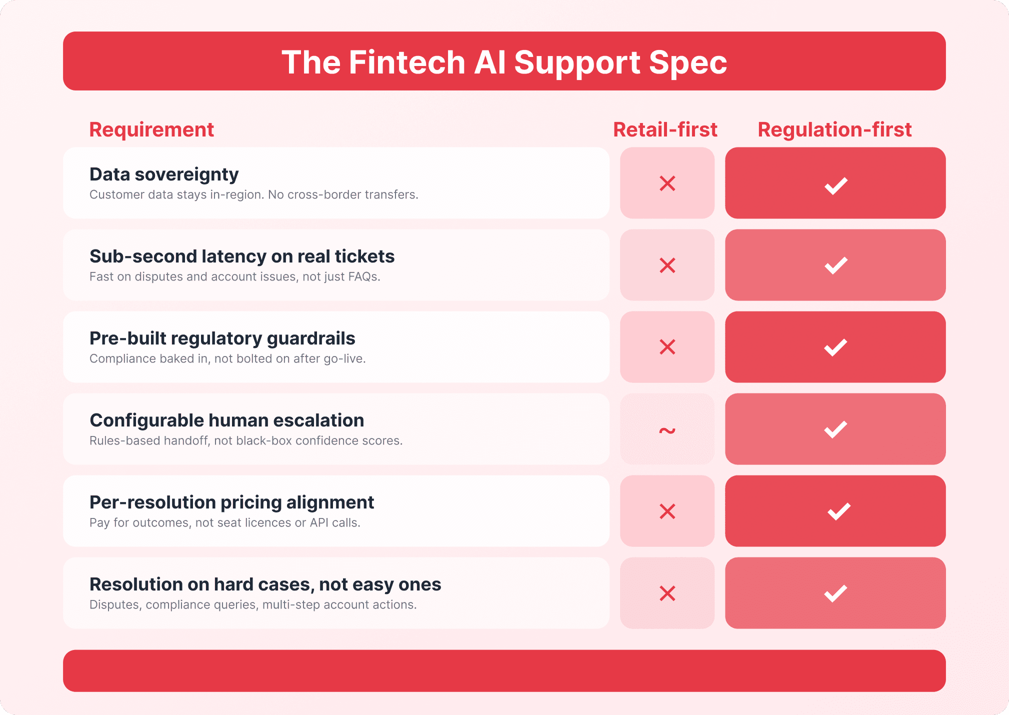 Every objection a fintech CX leader raises during an AI support evaluation is a line item in a spec that nobody has written down. Data sovereignty; sub-second latency on real tickets - transaction disputes, account queries, payment failures - not FAQ lookups; pre-built regulatory guardrails for financial hardship, complaints, and advice boundaries; configurable human escalation for distress and vulnerability; pricing that aligns the vendor's incentives with yours; and resolution rates on the hard cases, not just the easy ones.