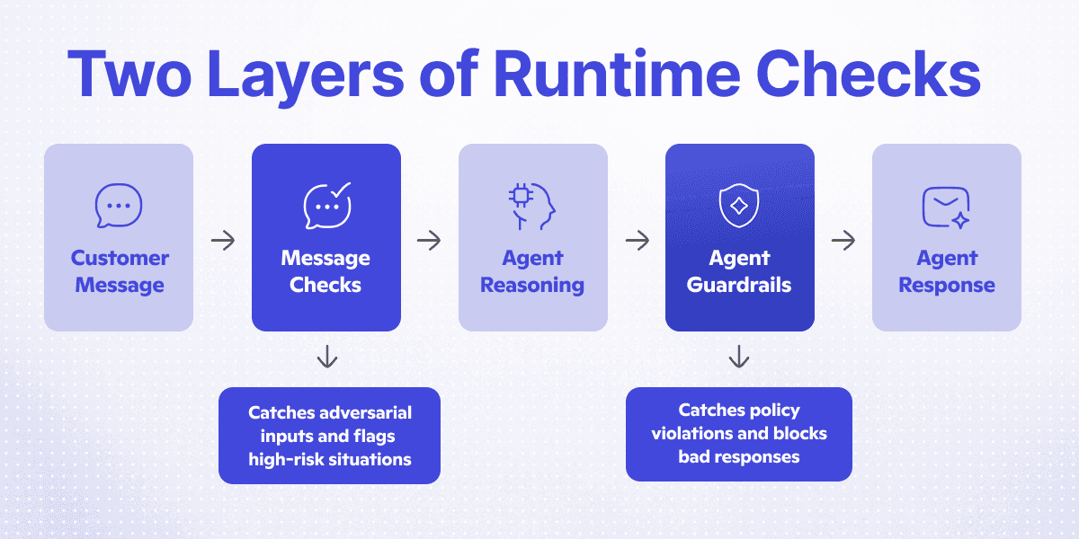 Agent guardrails check outgoing responses before they're sent. If the agent is about to offer an unauthorized refund, share incorrect information, or respond in a way that violates policy, the guardrail blocks it.
