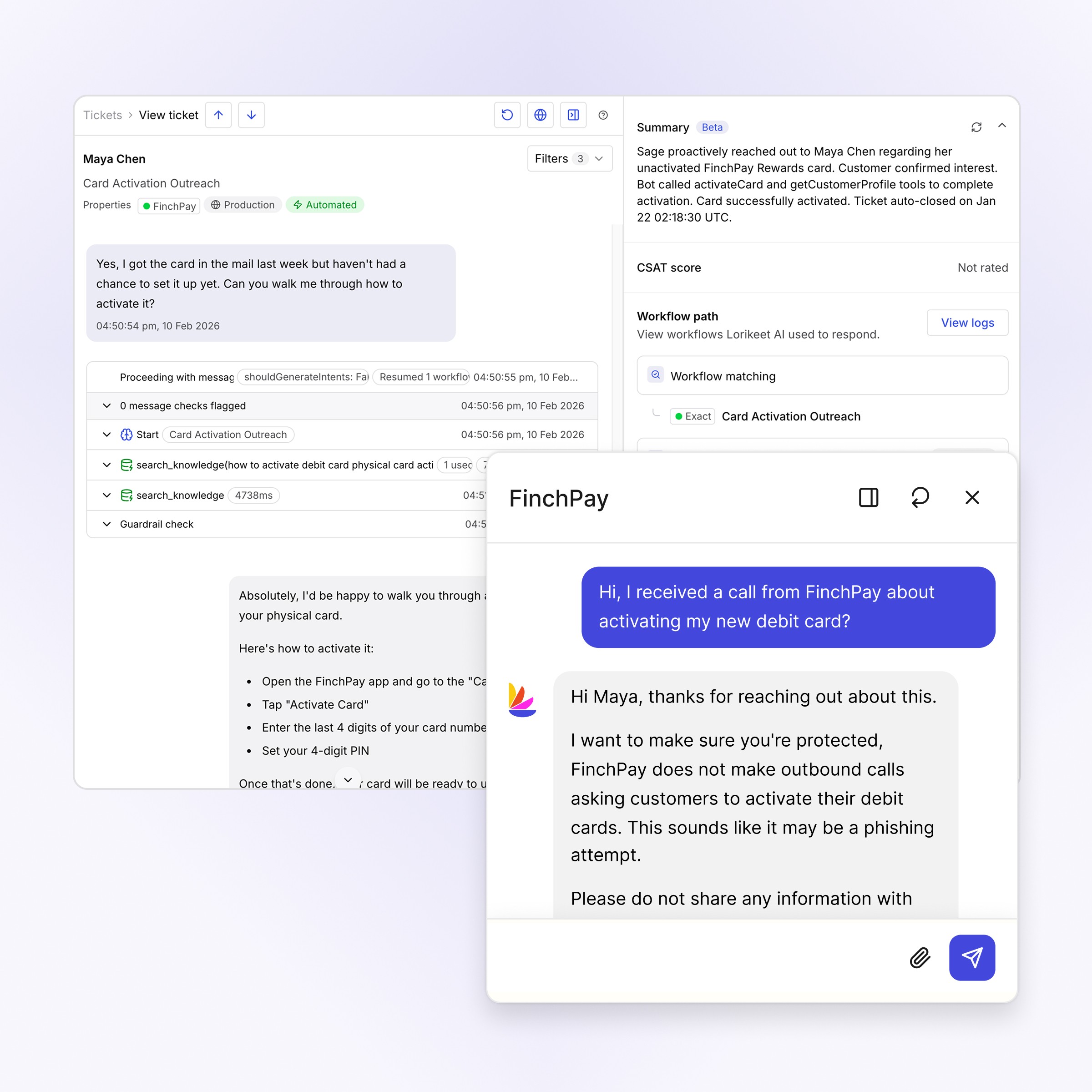 Lorikeet pulls live account context, follows your servicing policies and takes action in core systems: filing disputes, processing payments, verifying identity. When a case requires a specialist or regulatory review, it escalates with full interaction history so your team picks up mid-conversation.