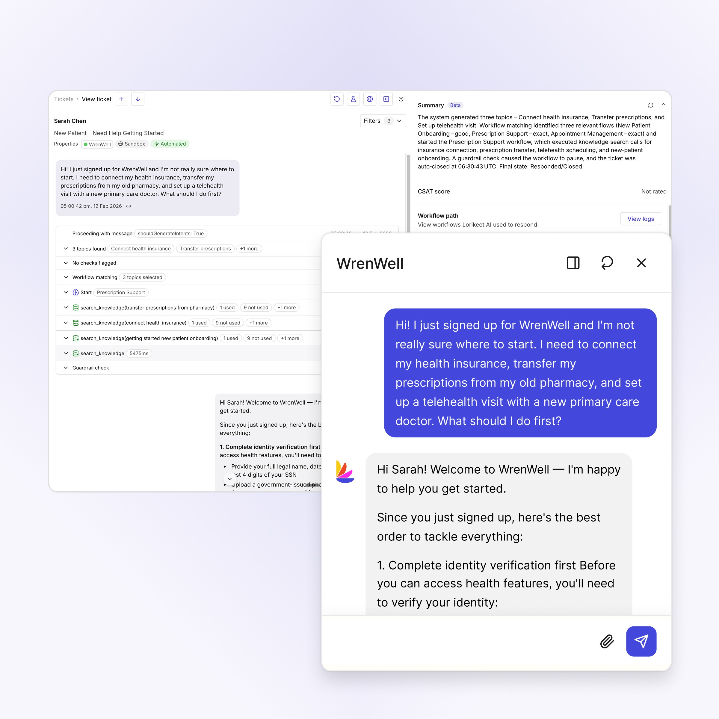 Move beyond deflection to real resolution. The Lorikeet AI Concierge pulls patient context, follows your policies, takes action in your systems, and closes the loop end-to-end. When a case needs a human, it escalates with full context so agents can pick up mid-conversation, not from scratch.