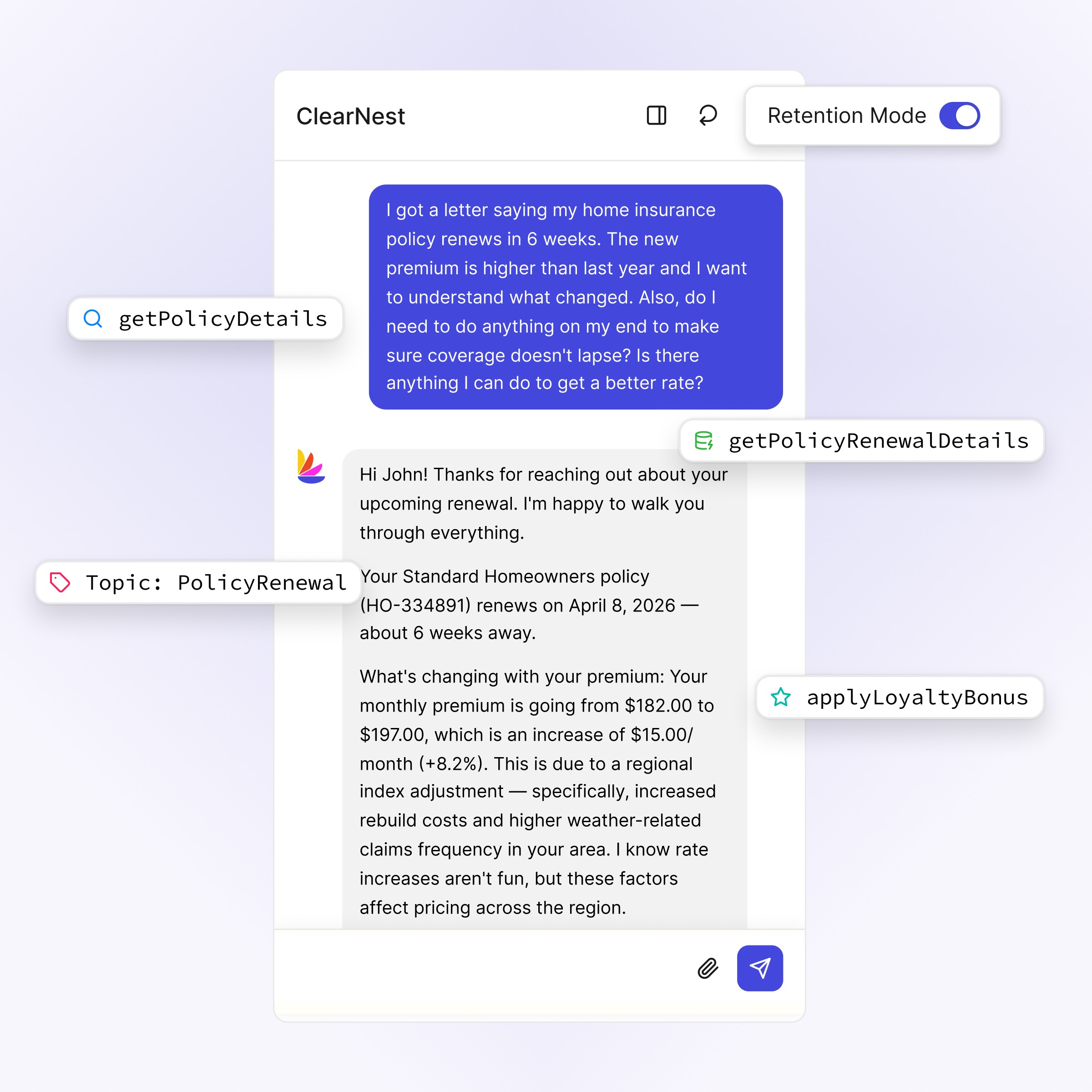 Every support interaction is a retention signal. Lorikeet's AI concierge resolves claims questions, billing disputes, and coverage inquiries in real time, so policyholders never wait on hold or get bounced between departments. When a conversation requires underwriting judgment or a sensitive claims decision, the AI escalates with full context so your team picks up mid-conversation. The result: faster resolution, higher NPS, and fewer policyholders shopping at renewal.