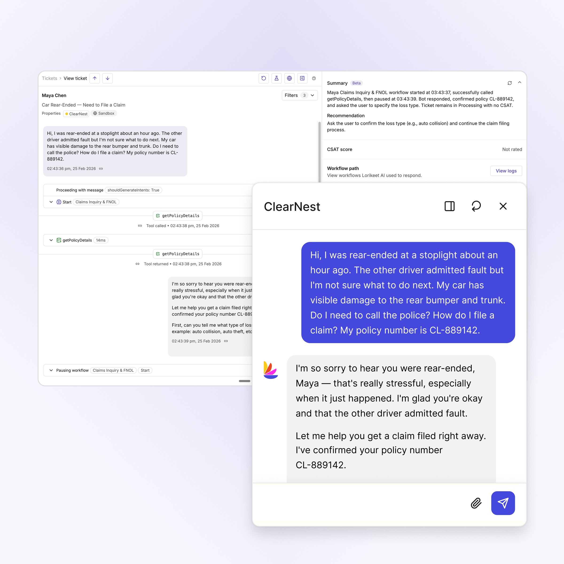 Move beyond deflection to real resolution. The Lorikeet AI Concierge pulls policyholder context, follows your business rules, takes action in your systems, and closes the loop end-to-end. When a case needs a human, it escalates with full context so agents can pick up mid-conversation, not from scratch.