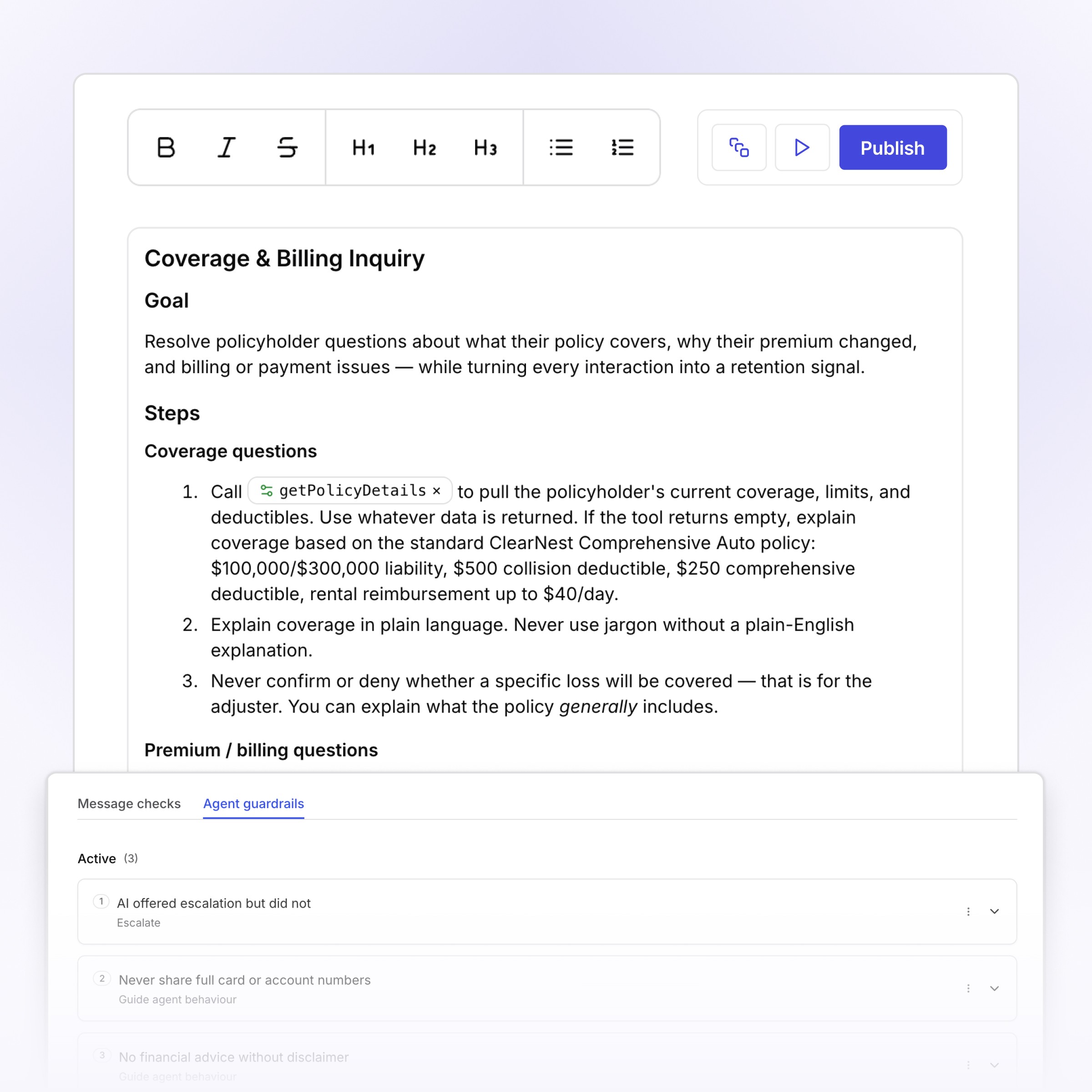 Purpose-built for insurance. Automate FNOL, claims status, policy servicing, and premium inquiries end-to-end, while reducing cost-to-serve.